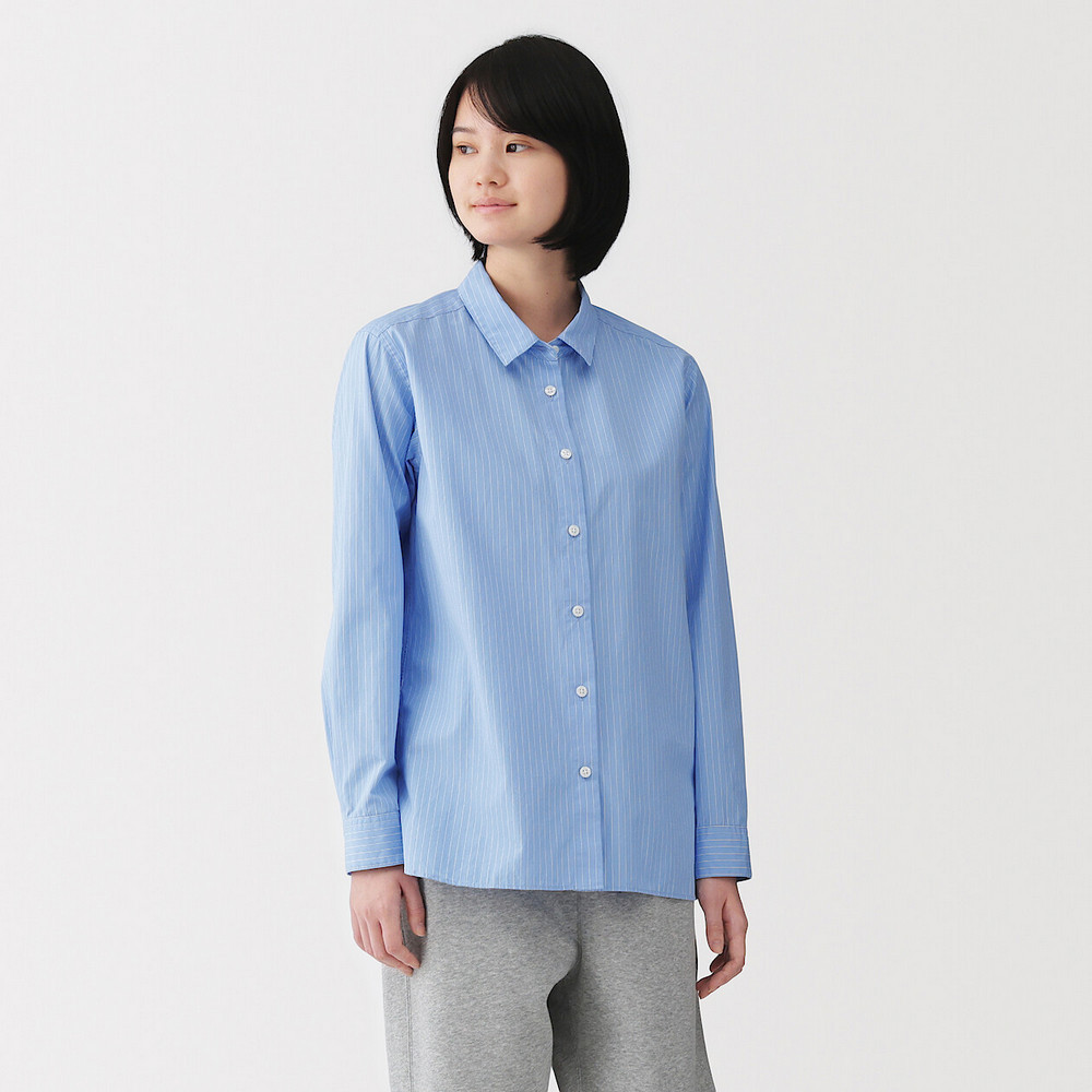 女水洗平織布標準領長袖襯衫淡藍直紋