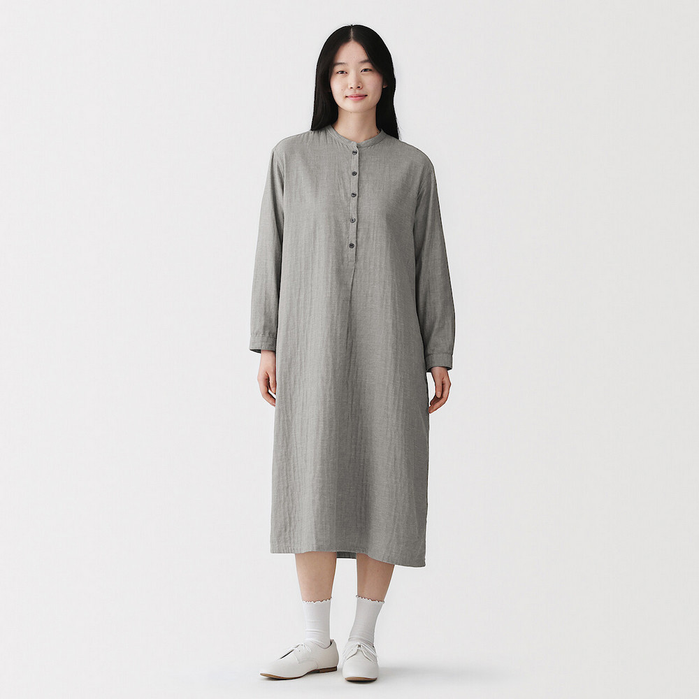 女吉貝木棉混二重紗織長袖洋裝黑色